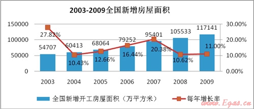 燃?xì)獗順I(yè)務(wù)與房產(chǎn)市場發(fā)展密切相關(guān)。2003年-2009年建筑房屋施工面積由259,377萬平方米增加到588,593萬平方米,年均增長14.6%。