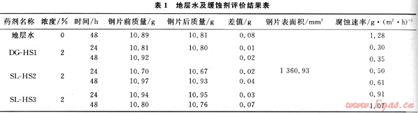 參照SY/T5390—91鉆井液腐蝕性能評價(jià)方法,在溫度120℃密閉條件下,熱滾16h后,測定了包括地層水及咪唑啉(SL-HS2)和聚季銨鹽(DG-HS1)、有機(jī)磷酸鹽(SL-HS3)復(fù)合緩蝕劑等在內(nèi)的3種介質(zhì)進(jìn)行了腐蝕速率的測定結(jié)果見表1。