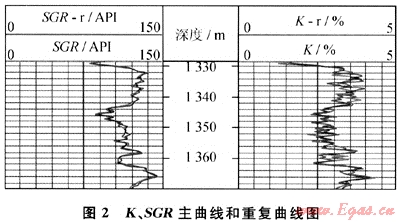 圖2為資料中深度校正后的總自然伽馬(SGR)、鉀含量(K)曲線的主曲線和重復(fù)曲線圖,石油天然氣行業(yè)標(biāo)準(zhǔn)SY/T 5132—2003《測井原始資料質(zhì)量要求》中對(duì)自然伽馬能譜測井重復(fù)性的要求為:重復(fù)曲線與主曲線形狀基本相同,總自然伽馬重復(fù)測量值相對(duì)誤差應(yīng)小于5%,鉀的重復(fù)測量值相對(duì)誤差應(yīng)小于10%。結(jié)合企業(yè)生產(chǎn)實(shí)際,約定重復(fù)誤差符合標(biāo)準(zhǔn)的井段總長度不得少于45m(常規(guī)測井重復(fù)曲線至少測50m,50m時(shí)90%要符合標(biāo)準(zhǔn),即50×90%=45m)。軟件經(jīng)計(jì)算得:曲線SGR重復(fù)曲線與主曲線相關(guān)系數(shù)為0.983,曲線校深后,重復(fù)誤差符合標(biāo)準(zhǔn)的井段總長度為53.5m;曲線K重復(fù)曲線與主曲線相關(guān)系數(shù)為0.765,校深后,重復(fù)誤差符合標(biāo)準(zhǔn)的井段總長度為36.5m。因此,軟件得到重復(fù)性檢查結(jié)論:曲線SGR合格,曲線K不合格。