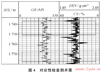 圖4是資料中伽馬曲線(GR)、密度曲線(DEN)、中子曲線(CN)。以GR曲線為基準(zhǔn)曲線劃分層段并挑選層段,1736.81~1750.61m和1768.01~1777.51m(圖中紅框標(biāo)示)是軟件挑選的兩個(gè)層段,在兩個(gè)層段DEN曲線和CN曲線的相關(guān)系數(shù)分別為-0.75和-0.74,與預(yù)先設(shè)置的規(guī)則(負(fù)相關(guān)、最小相關(guān)系數(shù)0.7,依據(jù)地區(qū)經(jīng)驗(yàn)設(shè)置)相比,軟件判斷DEN曲線和CN曲線的對(duì)應(yīng)性合格。