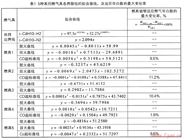 根據(jù)實(shí)驗(yàn)測得的各系列燃具在界限工況時對應(yīng)界限試驗(yàn)氣的組分?jǐn)?shù)據(jù),計(jì)算得到對應(yīng)燃?xì)獾娜紵匦詤?shù),及圖3~8所示的各特性曲線,進(jìn)行回歸分析與曲線擬合,其擬合曲線見表6。