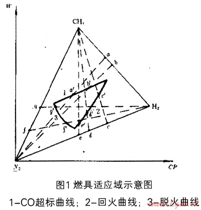 開發(fā)設(shè)計(jì)燃具時,首先要決定使用某類燃?xì)?。根?jù)某類燃?xì)獾幕鶞?zhǔn)氣[1]設(shè)計(jì)、生產(chǎn)后按照基準(zhǔn)氣及界限試驗(yàn)氣的要求(包括壓力)調(diào)整檢驗(yàn)出廠。當(dāng)燃?xì)庑再|(zhì)(成分)發(fā)生變化時,其工作狀態(tài)必然改變。如果燃?xì)獬煞肿兓谀骋唤缦薹秶鷥?nèi),它仍能保持正常工作。這就是燃具對燃?xì)獬煞肿兓倪m應(yīng)能力,稱為燃具的適應(yīng)性。每個燃具都有一定的適應(yīng)能力。量化這個適應(yīng)能力,可以用燃具適應(yīng)燃?xì)獬煞肿兓姆秶鷣肀硎?。適應(yīng)燃?xì)獬煞肿兓姆秶鷧^(qū)間稱為燃具適應(yīng)域。適應(yīng)域的范圍越寬,表示燃具的適應(yīng)燃?xì)鈿赓|(zhì)變化的能力越強(qiáng)[2]。