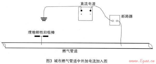 城市燃?xì)夤艿琅c長(zhǎng)輸燃?xì)夤艿老啾?,布局?fù)雜,支管多,管道周圍干擾因素多,燃?xì)庑孤┰斐傻奈:Υ?,必須?duì)城市燃?xì)夤芫W(wǎng)進(jìn)行定期的防腐層檢測(cè),確保安全[4]。目前我國(guó)的城市燃?xì)夤芫W(wǎng)陰極保護(hù)主要采取犧牲陽(yáng)極方法,而DCVG檢測(cè)技術(shù)需要外加電源,所以應(yīng)用時(shí)須在燃?xì)夤艿乐屑又绷麟娏?。直流電源的外加如圖3所示:可調(diào)節(jié)的直流電源正極接地,負(fù)極通過閥門測(cè)試樁或閥門井與燃?xì)夤艿辣谶B接,負(fù)極與燃?xì)夤艿乐g接電路通斷器來實(shí)現(xiàn)管路電流的周期性通斷。