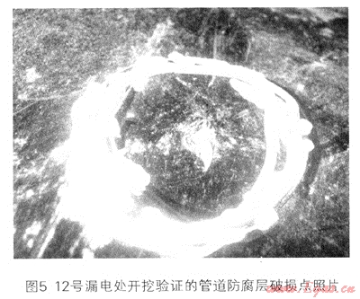 第二外加電流處,極化后,通電電位Von=-1560mV,斷電電位Voff=-1010mV,管道到遠(yuǎn)大地點(diǎn)的電位差為VT=550mV,犧牲陽(yáng)極上形成的電位差VTC為60mV,9~12處漏電點(diǎn)由2號(hào)測(cè)試樁提供的信號(hào)檢出,由表中數(shù)據(jù)可以看出,9號(hào)點(diǎn)檢測(cè)到的犧牲陽(yáng)極旁的土壤距遠(yuǎn)方大地的電位差Vs與犧牲陽(yáng)極上形成的電位差VTC基本相當(dāng),初步判斷為犧牲陽(yáng)極,隨后的開挖驗(yàn)證證實(shí)了此判斷。9、10、12號(hào)漏電點(diǎn)的IRC已經(jīng)大于100%,所以判斷這些點(diǎn)連接有犧牲陽(yáng)極,但不排出伴隨有防腐層破壞。其中12號(hào)漏電點(diǎn)的IRC已經(jīng)高達(dá)163%,伴隨有管道防腐層破壞的可能性很大。恰好此處具備開挖條件。開挖后發(fā)線該處有犧牲陽(yáng)極,同時(shí)伴隨有管道防腐層破壞,如圖5所示。另外,此12處漏電點(diǎn)相隔距離基本上是相隔200~400m,這也符合一般犧牲陽(yáng)極埋設(shè)距離,能夠?yàn)殛?yáng)極信號(hào)干擾排除提供依據(jù)。