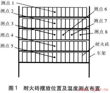 燃?xì)廨椛涓稍锔G的底部鋪設(shè)2道鋼軌,將耐火磚放置于小車架被推入窯中,在加熱過程中,耐火磚原地不動(dòng),吸收紅外輻射能量而升溫。耐火磚的擺放位置及溫度測點(diǎn)布置見圖1。