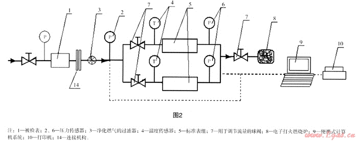 A. 總體思路:裝置采用標(biāo)準(zhǔn)表法對(duì)在線燃?xì)獗磉M(jìn)行檢定,其工作原理是:在線實(shí)流燃?xì)饨?jīng)過被檢表,根據(jù)實(shí)際流量大小流經(jīng)在線燃?xì)饬髁繕?biāo)準(zhǔn)裝置中的標(biāo)準(zhǔn)表,分別由標(biāo)準(zhǔn)表表前、表后的壓力傳感器測得被檢表表后及標(biāo)準(zhǔn)表前后的燃?xì)鈮毫?,由溫度傳感器測得管路中的燃?xì)鉁囟龋⑺鶞y數(shù)據(jù)傳輸至計(jì)算機(jī),被檢表前壓力及被檢表數(shù)據(jù)也輸入至計(jì)算機(jī),數(shù)據(jù)處理后,自動(dòng)判斷被檢表是否合格。經(jīng)過標(biāo)準(zhǔn)表后的燃?xì)膺M(jìn)入燃燒爐后被燃燒處理,可避免污染大氣。為了能使該裝置適用于較大的測量范圍,標(biāo)準(zhǔn)裝置中可以并聯(lián)設(shè)置多塊不同量程的標(biāo)準(zhǔn)表,根據(jù)實(shí)流燃?xì)獾膶?shí)際流量大小,選擇流經(jīng)相應(yīng)的標(biāo)準(zhǔn)表。在每一臺(tái)標(biāo)準(zhǔn)表前的管路上均設(shè)有流量調(diào)節(jié)閥。可根據(jù)流量大小選用任意一臺(tái)標(biāo)準(zhǔn)表,或同時(shí)開通并聯(lián)的兩臺(tái)或幾臺(tái)標(biāo)準(zhǔn)表,便于擴(kuò)大燃?xì)饬髁繖z測范圍。