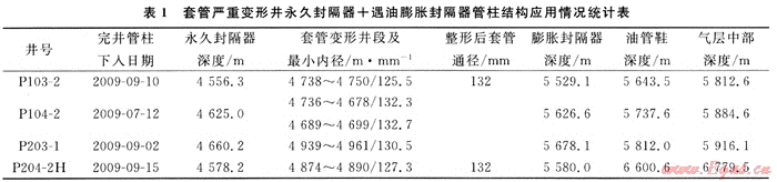 普光氣田套管變形井發(fā)生后,通過普光氣田主體嚴(yán)重套管變形井綜合修井技術(shù)研究,采用井下震擊整形技術(shù)、滾壓整形技術(shù)實(shí)現(xiàn)套管擴(kuò)徑,普光103-2、204-2H井整形后通徑達(dá)到132~134mm,保證小直徑遇油膨脹封隔器下井的要求;2009年7~9月份應(yīng)用外徑130mm遇油膨脹封隔器,采用“永久封隔器+遇油膨脹封隔器”采氣管柱結(jié)構(gòu),先后完成了普光103-2、104-2、203-1定向井、204-2H水平井投產(chǎn)作業(yè)施工,現(xiàn)場應(yīng)用效果較好(見表1),對高含硫嚴(yán)重套管變形井修井投產(chǎn)具有重要現(xiàn)實(shí)意義。