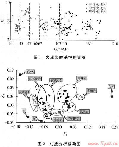 為了避免載荷圖上數(shù)據(jù)點過多影響對應(yīng)分析,首先得從樣本中挑選一些典型的、易于歸位的樣品用于對應(yīng)分析研究。利用對應(yīng)分析發(fā)現(xiàn)GR對研究區(qū)的火成巖巖性反應(yīng)最為敏感,圖1為利用GR對研究區(qū)火成巖酸基性的劃分,從另外一個角度驗證了對應(yīng)分析的正確性。CNL、P與N對研究區(qū)的巖性反應(yīng)次之。