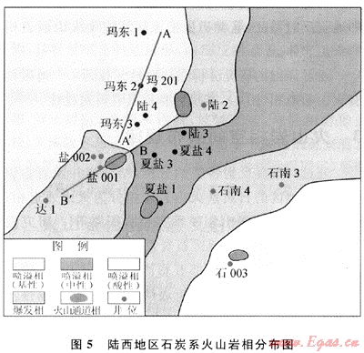 本區(qū)石炭系火山巖巖相分布基本確定,大致呈北東-南西向的條帶狀分布,西北部地區(qū)絕大部分是噴溢相的基性火山巖,向東南依次過渡為爆發(fā)相火山巖、噴溢相的中性火山巖;向北西方向再次出現(xiàn)了爆發(fā)相火山巖,該地區(qū)東南角是噴溢相的中酸性火山巖。從地震剖面上識別出本區(qū)有4個(gè)比較明顯的古火山口。在石炭紀(jì)時(shí)期,本區(qū)經(jīng)歷了大范圍的火山爆發(fā),噴發(fā)出的大量巖漿沿地勢向四周擴(kuò)散,巖漿由西北角的基性逐漸向南東過渡為中酸性。儲集條件也是由西北向東南逐漸變好,所以位于陸西地區(qū)東南部的石西凸起應(yīng)作為下一步勘探的重點(diǎn)區(qū)域。