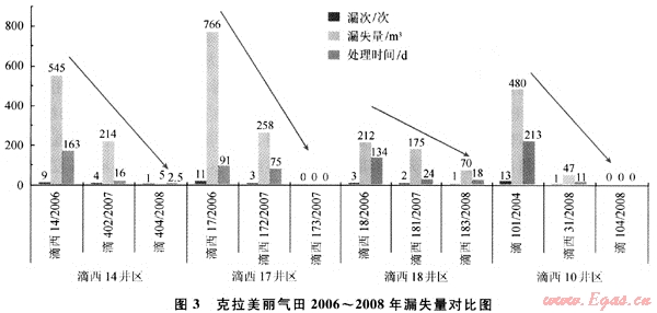 通過防漏、堵漏技術的應用及方案的有效實施,防漏、堵漏工作取得了明顯效果(圖3),2007~2008年上鉆的滴西20、滴西21、滴西22、滴西171、滴西172、滴西173、滴西181、滴西182、滴西183、滴402、滴404、滴103、滴104、滴西25、滴西31井等井發(fā)生井漏的次數(shù)、漏失量及處理井漏耗費時間均大幅度減少。