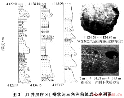 辮狀河三角洲前緣亞相主要由水下分流河道、河口壩、遠(yuǎn)砂壩和水下分流河道間組成[5]。辮狀河水下分流河道是辮狀河道入海后在水下的延續(xù)部分,該區(qū)巖心上可清楚地顯示出下粗上細(xì)的變化特征,一般從含礫砂巖到粉砂巖,河道底部沖刷特征明顯,礫石和泥礫發(fā)育(圖2),上部砂巖主要發(fā)育各種交錯(cuò)層理、平行層理和波紋層理,自然伽馬和聲波時(shí)差曲線表現(xiàn)為下粗上細(xì)的正韻律,主要為低幅、低齒化-齒化鐘形、箱形。河口壩位于水下分流河道的前緣,底部為粉砂巖,向上主要為中、細(xì)砂巖,其中小型板狀交錯(cuò)層理、小型波狀層理和水平層理發(fā)育,自然伽馬和聲波時(shí)差曲線均為齒化漏斗形反韻律特征。遠(yuǎn)砂壩為辮狀河三角洲前緣末端沉積,巖性以粉砂和細(xì)砂為主,厚度薄,可見透鏡狀層理,自然伽馬和聲波時(shí)差曲線也為齒化漏斗形反韻律特征。分流河道間沉積常為粉砂巖與泥巖,顏色較深,多為灰色及灰綠色,自然伽馬和聲波時(shí)差曲線為高幅平直形。在地震剖面上,辮狀河三角洲沿傾向方向?yàn)榍胺e反射,沿走向方向?yàn)橥哥R狀或丘形反射[6]。