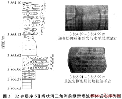 濁積體為辮狀河三角洲前緣沉積物發(fā)生滑動(dòng)或滑塌而成的砂巖堆積體,往往位于三角洲前緣的主推進(jìn)方向前方的古地形低洼處,通常規(guī)模較小,呈小型透鏡體狀,厚度也較薄,本區(qū)濁積體巖性細(xì),以粉-細(xì)砂巖為主,發(fā)育段成砂泥巖薄互層,砂巖中見變形構(gòu)造,并有沖刷面、遞變層理、波紋層理、塊狀層理等,近底部含泥礫或礫石,具有典型的鮑瑪序列,鮑瑪序列一般發(fā)育不完整,A、C、E段較為多見(圖3)。地震剖面上;響應(yīng)于丘形或透鏡狀反射特征。
