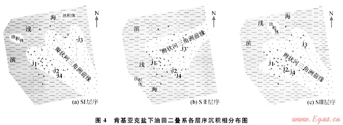 2) 肯基亞克鹽下油田二疊系主要發(fā)育辮狀河三角洲前緣、濁積體和濱淺海沉積。層序SⅠ、SⅢ辮狀河三角洲前緣從東南方由盆地邊緣向中心延伸,層序SⅡ辮狀河三角洲前緣從東北方由盆地邊緣向中心延伸,周圍為濱淺海沉積,在三角洲前緣向盆地延伸的前方發(fā)育了土豆?fàn)畹娜侵耷熬壔鷿岱e體。