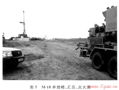 2) M-18井井噴情況:該井設(shè)計井深為693m,下入表層套管Ø324mm×204.86m+Ø245mm ×438.06m。2005年11月12日使用Ø216mm鉆頭鉆至井深514.50m,鉆井泵的噴淋泵壞,進(jìn)行修泵(設(shè)備配套僅一臺泵)工作,在活動鉆具5min后,發(fā)生強(qiáng)烈井噴,進(jìn)行關(guān)井,套壓為2.5MPa,鉆井液密度為1.14g/cm3,黏度為56s,放噴點(diǎn)火情況(見圖5)。然后使用密度為1.23g/cm3的鉆井液進(jìn)行壓井,恢復(fù)正常。
