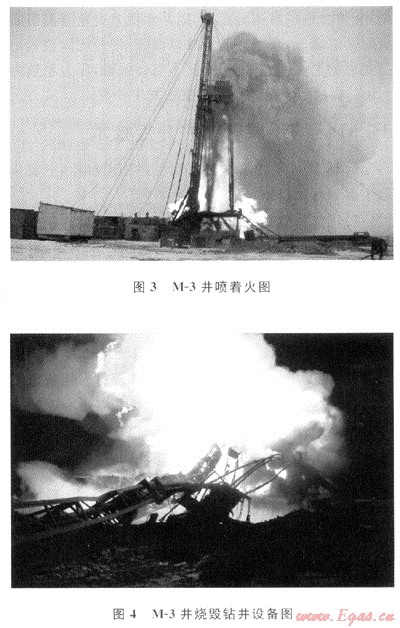 5) M-3井:于2004年2月8日開鉆,套管下深Ø324mm×146m,2004年2月15日使用Ø295.3mm鉆頭鉆至401m完鉆,鉆井液性能:密度為1.16g/cm3;黏度為48s,在316~323m井段,打開淺氣層。循環(huán)后全烴為0.5%,起鉆至井深316m,循環(huán)1h全烴由25%降至0.2%,至2004年2月16日起鉆至井深300m,發(fā)現(xiàn)溢流,當(dāng)搶接方鉆桿時,氣體和鉆井液混合物涌出轉(zhuǎn)盤面,關(guān)井失敗,井噴失控、著火、燒毀設(shè)備(見圖3、4)。經(jīng)過拆除、清理被毀設(shè)備,爆破滅火,更換井口裝置,連接液壓控制管線,關(guān)閉防噴器之后,注水泥塞,該井工程報廢(大火燃燒6d)。