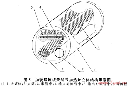 為加強(qiáng)天然氣加熱爐大筒體內(nèi)有效傳熱流場(chǎng)的組織,提出一種大筒體內(nèi)加裝導(dǎo)流板組織熱流場(chǎng)的改良結(jié)構(gòu)(國(guó)家發(fā)明專(zhuān)利:ZL200810036446.4):在筒體上部的冷卻受熱面和筒體下部的加熱受熱面之間,沿簡(jiǎn)體軸向設(shè)置導(dǎo)流板,導(dǎo)流板的長(zhǎng)度可按實(shí)際需要沿筒體軸向分割成幾塊,這樣便于加工安裝和提高使用效果,如圖5所示。