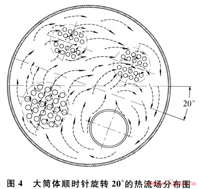 針對(duì)天然氣加熱爐大筒體內(nèi)無(wú)法形成有效傳熱流場(chǎng)的缺點(diǎn),首先提出一種旋轉(zhuǎn)型圓筒式天然氣加熱爐(國(guó)家實(shí)用新型專(zhuān)利:ZL200820057571.9):將大筒體內(nèi)對(duì)稱(chēng)布置的加熱受熱面(即火筒和煙管束,以及冷卻受熱面)旋轉(zhuǎn)適當(dāng)?shù)慕嵌龋辜訜崾軣崦姹M可能置于較低的位置[8](如圖4所示),這時(shí)大筒體內(nèi)溫度最高的火筒位于筒體的最下部,形成一股較強(qiáng)向上的熱壓,增大引起自然對(duì)流的動(dòng)力,由于火筒、煙管束和對(duì)流管束內(nèi)的流體存在溫差,促使大簡(jiǎn)體內(nèi)中間載熱介質(zhì)形成順時(shí)針循環(huán)順暢的熱流場(chǎng),消除大筒體底部的“死角”,達(dá)到強(qiáng)化傳熱,提高效率的目的。研究表明:該旋轉(zhuǎn)角度以20°為最佳[9],旋轉(zhuǎn)太小,達(dá)不到增大動(dòng)力的目的;旋轉(zhuǎn)太大,會(huì)導(dǎo)致煙管束與輸入對(duì)流管束處于同一水平位置,反而破壞了順暢流場(chǎng)的形成。