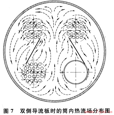 實(shí)際應(yīng)用中,亦可布置雙側(cè)導(dǎo)流板(圖7),火筒和煙管束周?chē)纳仙髟陔p導(dǎo)流板的引導(dǎo)下,分別流經(jīng)各自上方的對(duì)流管束放熱后,向下回流到火筒和煙管束附近,從而在大筒體內(nèi)形成了更有效的雙循環(huán)流場(chǎng)。