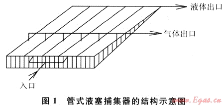 大型的液塞捕集器通常用一些標(biāo)準(zhǔn)管段來制造,即管式液塞捕集器,其儲存段由許多傾斜的平行管組成(圖1)。管式液塞捕集器主要包括兩部分[1]:①入口分離部分,用于氣液分離;②儲液部分,是一組平行下傾管段,用于貯存液體,常由標(biāo)準(zhǔn)直徑的管段制造。