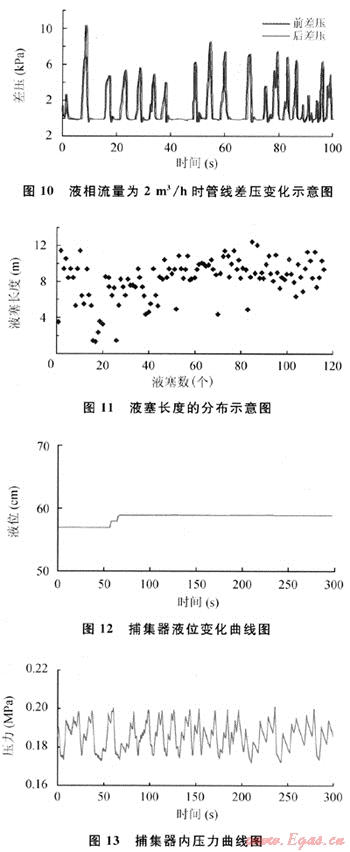 由圖12、13可以看出,在實驗工況下,捕集器內(nèi)液位能保持穩(wěn)定,而捕集器內(nèi)的壓力隨著較大段塞的進入有所波動,這與間歇通入氣體有關(guān),但波動不大,基本在0.18MPa左右。由此可知捕集器在較大長度液塞工況下運行穩(wěn)定。