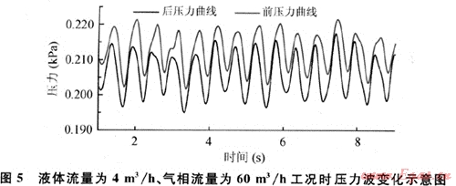 利用高速數(shù)據(jù)采集系統(tǒng)Lab-View,在實驗環(huán)道上可完成段塞頻率和壓力波動幅度測試,圖6為氣相流量為60m3/h、液相流量為4m3/h時由測壓點測得的壓力隨時間的變化圖(以該工況為例說明管式液塞捕集器的工作性能)。從圖5看出,在8s內(nèi)出現(xiàn)了14個不同的段塞,并可確定段塞周期、頻率、段塞長度以及段塞流動時壓力變化情況。