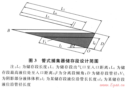 式中:D為管徑;l2為儲存段液位沿管長長度;β為分離段傾角;VL為液體體積。列出一系列管徑及管根數(shù)并循環(huán)計算,當(dāng)L5<L2時計算得到的結(jié)果為捕集器的初步設(shè)計尺寸。