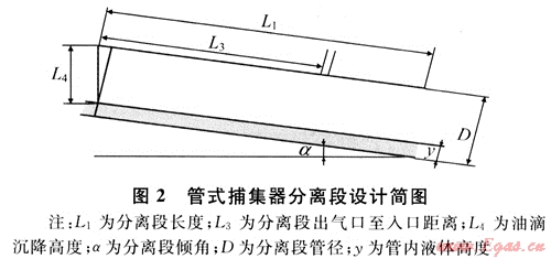 按照從氣體中分離出液滴的要求,計算得出氣體出口的位置L3,按照規(guī)定的比例關(guān)系,計算得到捕集器分離段的管長L1。改變傾角的值,重復(fù)計算得到最優(yōu)的傾角、管徑、管長值。