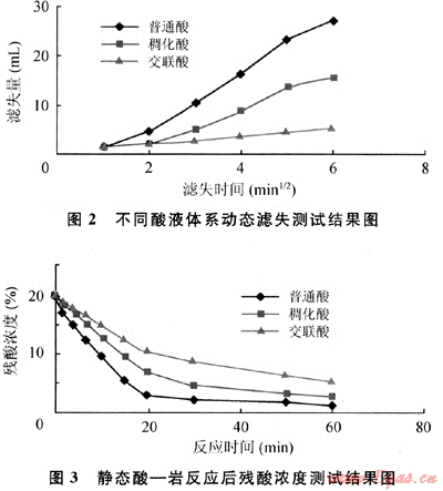 針對普通酸、稠化酸、交聯(lián)酸三種酸液體系分別進(jìn)行了反應(yīng)動力學(xué)行為測試、酸液濾失性測試及60℃恒溫水浴靜態(tài)酸-巖反應(yīng)測試,結(jié)果表明(見表1及圖2、3):氫離子傳質(zhì)系數(shù)越低,反應(yīng)速率越慢,則酸液控濾失效果越好(濾失量越少),酸-巖反應(yīng)后的殘酸濃度就越高。文中交聯(lián)酸酸液體系顯示了良好的控濾失性能。