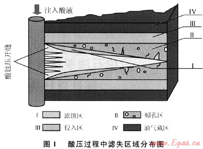 由于蚓孔地層的濾失,降低了酸液實(shí)際有效作用距離,增加的注液量僅對近井帶的儲層改造,最終導(dǎo)致增產(chǎn)效果不理想。因此,實(shí)際酸壓過程中酸液的濾失主要包括裂縫壁面向基質(zhì)的濾失和酸蝕蚓孔濾失兩部分[6],并且細(xì)分為4個(gè)區(qū)域(圖1)。其中,酸液濾失主要受到蚓孔區(qū)(Ⅱ)內(nèi)蚓孔擴(kuò)展速度及侵入?yún)^(qū)(Ⅲ)內(nèi)與流動剪切及裂縫溫度有關(guān)的酸液黏度所控制。另外,地層一旦形成蚓孔,酸液濾失則主要在蚓孔內(nèi)發(fā)生,濾失量由蚓孔擴(kuò)展體積和酸液向酸蝕螞孔壁面濾失量共同決定。