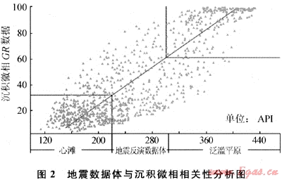 為保證震控的精確性,首先進(jìn)行各種地震數(shù)據(jù)體與測井沉積微相相關(guān)性分析,優(yōu)選能夠較好區(qū)分沉積微相的地震數(shù)據(jù)體。通過井-震數(shù)據(jù)分析發(fā)現(xiàn):地震伽馬反演數(shù)據(jù)體與沉積微相具有很好的相關(guān)性[4](圖2),該數(shù)據(jù)體可用來做井間震控約束。