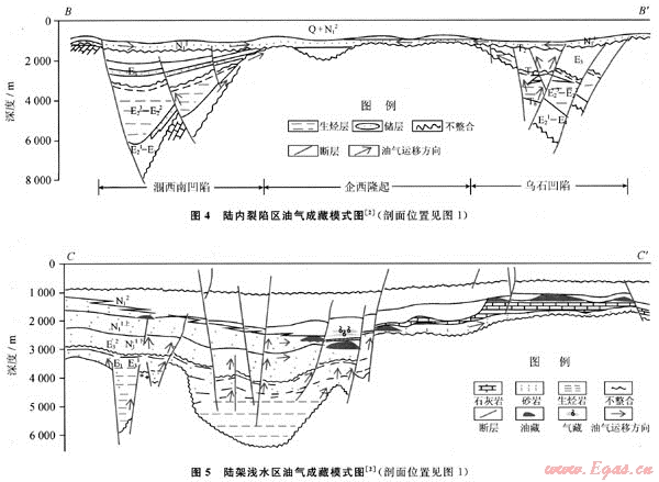 2) 走滑拉分區(qū)油氣成藏主要受控于泥底辟構(gòu)造活動(dòng),產(chǎn)生的大量垂向斷層、裂縫是油氣運(yùn)移的主要通道,下部含油氣系統(tǒng)比上部更具資源潛力;陸內(nèi)裂陷區(qū)斷裂構(gòu)造發(fā)育,企西隆起東部鄰近生烴凹陷,油氣地質(zhì)條件優(yōu)越,是尋找大中型油田的有利區(qū)帶;陸架淺水區(qū)“皮薄肉厚”,油氣勘探應(yīng)以古近系陸相斷陷沉積的儲(chǔ)蓋組合類型為主,首選洼中隆及斷裂活動(dòng)區(qū)。
