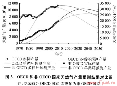為了說(shuō)明多循環(huán)模型在預(yù)測(cè)產(chǎn)量方面的比較優(yōu)勢(shì),運(yùn)用單循環(huán)廣義翁氏模型對(duì)0ECD國(guó)家和非OECD國(guó)家天然氣產(chǎn)量進(jìn)行預(yù)測(cè),將其與多循環(huán)廣義翁氏模型的預(yù)測(cè)結(jié)果進(jìn)行對(duì)比,見(jiàn)圖3和表1。
