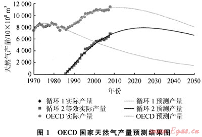對(duì)于存在2個(gè)產(chǎn)量循環(huán)的地區(qū)而言,需要求解2組參數(shù),每組包含3個(gè)參數(shù),運(yùn)用線性試差法對(duì)待定參數(shù)進(jìn)行求解,然后將求解的參數(shù)代入產(chǎn)量和儲(chǔ)量公式確定產(chǎn)儲(chǔ)量。產(chǎn)量預(yù)測(cè)結(jié)果如圖1所示。循環(huán)1所用預(yù)測(cè)數(shù)據(jù)為1970~1985年OECD國(guó)家實(shí)際產(chǎn)量數(shù)據(jù),循環(huán)2所用預(yù)測(cè)數(shù)據(jù)是用1986~2008年OECD國(guó)家實(shí)際產(chǎn)量數(shù)據(jù)減去同期循環(huán)1的預(yù)測(cè)數(shù)據(jù)得到的等效實(shí)際產(chǎn)量數(shù)據(jù),然后將二者的預(yù)測(cè)結(jié)果疊加,得到OECD國(guó)家天然氣產(chǎn)量預(yù)測(cè)的最終結(jié)果。同理可得非OECD國(guó)家的天然氣產(chǎn)量預(yù)測(cè)結(jié)果(圖2)。
