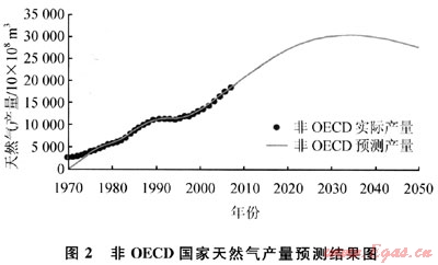 通過(guò)預(yù)測(cè),世界天然氣產(chǎn)量峰值將于2031年左右到來(lái),峰值產(chǎn)量約為4.04×1012m3,最終可采儲(chǔ)量約為395.21×1012m3。同時(shí),對(duì)比0ECD國(guó)家與非OECD國(guó)家的產(chǎn)量曲線可以看出,0ECD國(guó)家未來(lái)的產(chǎn)量增長(zhǎng)空間較小,到2013年后產(chǎn)量將逐漸減小;而非OECD國(guó)家產(chǎn)量增長(zhǎng)空間較大。因此,我國(guó)在確定天然氣發(fā)展戰(zhàn)略時(shí),應(yīng)將非0ECD國(guó)家列為主要戰(zhàn)略合作國(guó),及早加強(qiáng)合作。