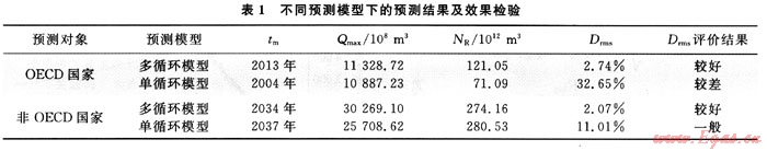 由圖3可知,單循環(huán)模型對(duì)最后一個(gè)產(chǎn)量循環(huán)的擬合程度較高,但對(duì)于之前的產(chǎn)量循環(huán),擬合程度則比較低,導(dǎo)致其對(duì)最終可采儲(chǔ)量的預(yù)測(cè)誤差偏大,而多循環(huán)模型則彌補(bǔ)了這一不足。由表1可知,多循環(huán)模型預(yù)測(cè)0ECD國(guó)家和非0ECD國(guó)家的Drms分別為2.74%和2.07%,均明顯小于單循環(huán)模型的預(yù)測(cè)結(jié)果,表明多循環(huán)模型的評(píng)價(jià)效果比較好。