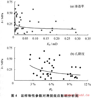 滑脫效應(yīng)強(qiáng)弱程度可采用滑脫因子描述;滑脫因子(b)越大對氣體滲流影響越大,反之越小;不同物性參數(shù)條件下氣體滑脫效應(yīng)現(xiàn)象程度強(qiáng)弱不一樣。研究表明:隨著氣相有效孔隙度、有效滲透率增加,滑脫效應(yīng)影響程度相應(yīng)減弱(圖4)。對于廣安氣田須六段氣藏,含水巖樣滑脫因子介于0.063~0.675MPa之間。