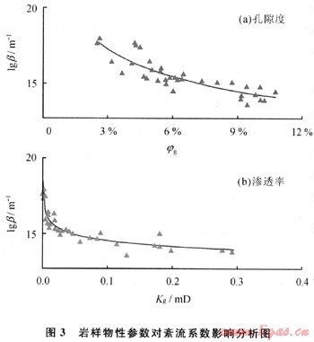 高速非達(dá)西滲流特征是多孔介質(zhì)中氣體滲流普遍存在的特殊滲流現(xiàn)象。不同的物性參數(shù)條件下高速非達(dá)西滲流效應(yīng)對氣體滲流的影響程度不同,紊流系數(shù)(β)的大小直觀反映了高速非達(dá)西對氣體滲流的影響程度。物性參數(shù)與紊流系數(shù)關(guān)系實(shí)驗(yàn)結(jié)果見圖3。總體而言,隨著氣相有效孔隙度及氣相有效滲透率增加,紊流系數(shù)逐漸減小,表明儲(chǔ)層物性越差高速非達(dá)西滲流效應(yīng)越明顯。