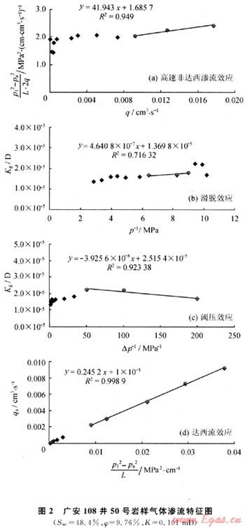 國內(nèi)外長期的滲流實(shí)驗(yàn)研究確認(rèn)了氣體特殊滲流效應(yīng)對應(yīng)的實(shí)驗(yàn)現(xiàn)象,并根據(jù)大量的實(shí)驗(yàn)數(shù)據(jù)建立了相應(yīng)的數(shù)學(xué)描述關(guān)系式[2~4]。2008年馮曦等根據(jù)單相氣體不同滲流運(yùn)動(dòng)方程建立了對應(yīng)的滲流效應(yīng)診斷方法,提高了診斷精度[5~6]。筆者以上述方法為基礎(chǔ),對所有實(shí)驗(yàn)樣品的滲流機(jī)理進(jìn)行診斷分析。