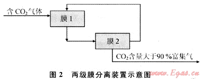 膜分離法是利用某些聚合材料制成的薄膜對(duì)不同氣體具有不同滲透率來(lái)選擇分離氣體的。膜分離的驅(qū)動(dòng)力是膜兩側(cè)的壓差,在壓差條件下,滲透率高的氣體組分優(yōu)先透過(guò)薄膜,形成滲透氣流,滲透率低的氣體則在薄膜進(jìn)氣側(cè)形成殘留氣流,兩股氣流分別引出從而達(dá)到分離的目的[21]。適用于CO2分離的膜材料為乙酸纖維、聚砜、聚酰胺等,由于膜本身或膜組件的其他材料耐熱性能差,150℃是其操作溫度的上限。近年來(lái)一些性能優(yōu)異的新型膜材質(zhì)正不斷涌現(xiàn),如聚酰亞胺膜、聚苯氧改性膜、二胺基聚砜復(fù)合膜、含二胺的聚碳酸酯復(fù)合膜、丙烯酸酯的低分子含浸膜等均表現(xiàn)出優(yōu)異的C02滲透性。最近也有一些硅石、沸石和碳素?zé)o機(jī)膜的研制,但均存在使用溫度高、成本高,長(zhǎng)期運(yùn)行可靠性差等問(wèn)題。圖2為兩級(jí)膜分離富集CO2流程圖。