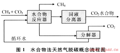 圖1為利用水合物分離技術(shù)進(jìn)行天然氣中捕集CO2的流程:將經(jīng)過(guò)預(yù)處理過(guò)酸性天然氣通入水合反應(yīng)器,在合適的操作條件下使混合氣中易生成水合物的CO2組分生成CO2水合物,被提濃的CH4自反應(yīng)器頂部引出。所生成的CO2水合物經(jīng)脫水后可直接利用[20],或隨水轉(zhuǎn)入水合物分解器中,分解后回注油氣藏以提高采收率。分解后的水或水與添加劑的混合物返回水合反應(yīng)器,循環(huán)利用。