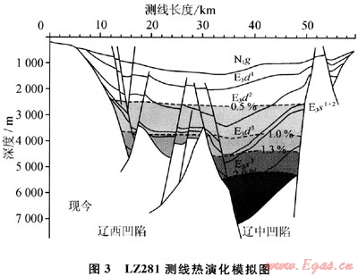 遼東灣地區(qū)有多個次級構(gòu)造帶,各凹陷烴源巖的演化程度有較大差異。為了進(jìn)一步揭示和刻畫其演化差異,在單井模擬的基礎(chǔ)之上,結(jié)合以往研究成果,從該區(qū)選擇了10條二維剖面(圖1),應(yīng)用EASY%Ro模型進(jìn)行埋藏史、熱史和成熟度演化史模擬。以測線LZ281剖面成熟度演化史模擬為例(圖3),模擬結(jié)果表明:整體來看,對于同一層位來說,與遼中凹陷相比,遼西凹陷的熱演化程度較低。遼東灣的生烴門限約為深度2500m(Ro>0.5%),遼中凹陷東二下段和遼西凹陷的東三段烴源巖進(jìn)入生烴門限。遼東灣地區(qū)的排烴高峰(0.8%<Ro<1.0%)為深度3400~3600m,遼中凹陷東三段下部及沙一、二段烴源巖和遼西凹陷沙三段烴源巖處于排烴高峰階段,產(chǎn)生大量液態(tài)烴。深度超過4400m處,遼中凹陷大部分沙三段烴源巖進(jìn)入高成熟階段(Ro>1.3%),以生成凝析氣、濕氣為主;沙四段烴源巖Ro>2.0%,進(jìn)入過成熟階段??梢?,現(xiàn)今遼西凹陷東三段-沙三段主力烴源巖主要處于生、排烴高峰,生成大量油氣,是目前遼西凹陷及其周圍地區(qū)內(nèi)一系列大中型油氣田發(fā)現(xiàn)的物質(zhì)基礎(chǔ);而遼中凹陷熱演化程度較高,除東下段和沙一二段烴源巖還處于生油階段,沙三段烴源巖主要處于生氣階段,是遼中凹陷和遼西低凸起發(fā)現(xiàn)大規(guī)模凝析氣田和油田的物質(zhì)基礎(chǔ)。