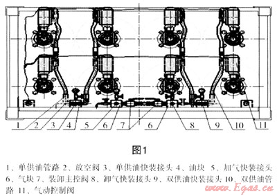 天然氣液壓子站加氣半掛車是將由8只大直徑氣瓶的管束橇安裝在1個(gè)可以舉升15°角的專用底盤上。前后倉內(nèi)各氣瓶端口均設(shè)有氣動(dòng)控制閥、安全放散裝置及充卸氣管路等,如圖1。