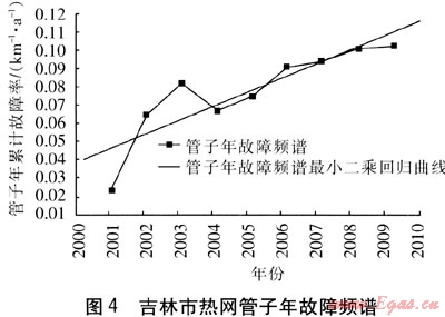 ③ 對吉林市熱力有限公司熱網(wǎng)管子進行年故障頻譜分析發(fā)現(xiàn),隨著運行年份的延續(xù),吉林市熱網(wǎng)管子年累計故障率整體呈上升趨勢,且熱網(wǎng)管子年累計故障率的增長速率為0.0079km-1·a-1。