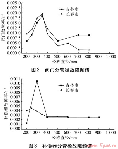② 閥門的分管徑故障率變化與管子不同,表現(xiàn)在具有一大一小兩個高峰,大高峰發(fā)生在DN 300mm左右,小高峰發(fā)生在DN 750~800mm。補償器的故障率只在DN 300mm左右出現(xiàn)一個高峰。
