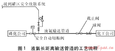 本項目在液氨長距離輸送管道的起點磷化公司廠區(qū)內(nèi)設(shè)置球閥1個,且為了保證出廠壓力及預(yù)防管道破損等事故,安裝了安全自動切斷閥1個,閥后設(shè)安全放散閥組1套,連接到廠區(qū)罐區(qū)內(nèi)的安全放散系統(tǒng);為控制管道的末端壓力,且為保證將來檢修方便,在終點化工公司廠區(qū)內(nèi)設(shè)置截止閥和球閥各1個。工藝流程見圖1。