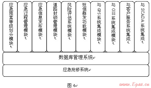 應(yīng)急搶修系統(tǒng)由應(yīng)急預(yù)案等級(jí)劃分模塊、應(yīng)急過(guò)程管理模塊、應(yīng)急信息發(fā)布模塊、道路封鎖管理模塊、風(fēng)險(xiǎn)評(píng)估系統(tǒng)模塊、短信群發(fā)功能模塊、與GPS系統(tǒng)集成、與GIS系統(tǒng)集成、與CIS系統(tǒng)集成、與SCADA系統(tǒng)集成模塊等組成。功能模塊結(jié)構(gòu)見(jiàn)圖4