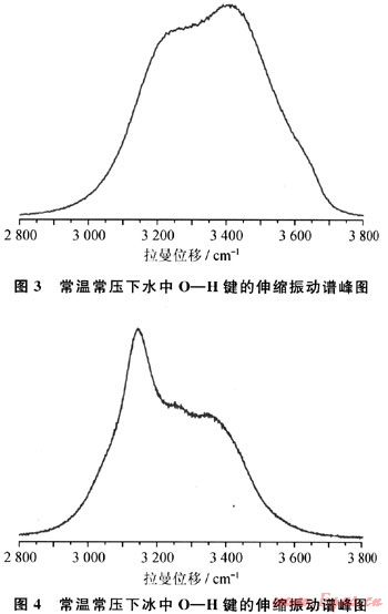 圖3和圖4分別是液態(tài)水和冰的拉曼譜圖。2800~3000cm-1為O—H鍵的伸縮振動譜峰,是水的特征譜帶。該區(qū)域內(nèi)寬而高的饅頭峰實際上是由4個峰疊加而成的,它們是3241cm-1處的帶氫鍵的O—H鍵的對稱伸縮振動峰,3415cm-1處帶氫鍵的0—H鍵的反對稱伸縮振動峰,3540cm-1處不帶氫鍵的O—H鍵對稱伸縮振動峰以及3617cm-1處不帶氫鍵的O—H反對稱伸縮振動峰[8~11]。各個峰位代表了分子轉(zhuǎn)動或振動的頻率,揭示了原子間距和作用力的信息。2800~3000cm-1區(qū)域內(nèi)各個峰所占的比例,反映了水中氫鍵斷裂的數(shù)目。從圖3可以看出,液態(tài)水中原子間距較大,形成的氫鍵較少,所以3241cm-1和3415cm-1處峰所占比例較小。而圖4所示的冰的拉曼譜圖中,3540cm-1和3617cm-1,處的拉曼峰幾乎消失,這主要是因為冰中水分子通過氫鍵構(gòu)成了四面體結(jié)構(gòu),原子間距較小,氫鍵數(shù)目較多,因而3241cm-1和3415cm-1處峰所占比例較大。