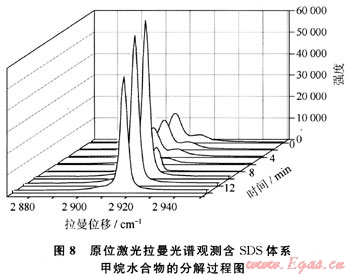 圖8是由SDS水溶液合成的甲烷水合物的分解過程拉曼譜圖。譜圖范圍在2850~2950cm,主要觀測了水合物的分解過程中甲烷分子的拉曼譜圖變化。從圖中可以看出,由SDS溶液合成的甲烷水合物也為Ⅰ型結(jié)構(gòu)水合物,與干水甲烷水合物分解過程類似,隨著水合物的不斷分解大、小籠中甲烷分子的拉曼雙峰發(fā)生了與干水甲烷水合物相同的變化,甲烷雙峰呈現(xiàn)此消彼長的過程,并最終變?yōu)閱畏濉?/span>
