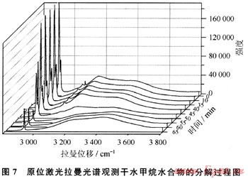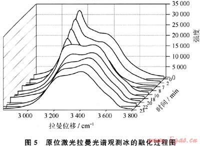 圖5是原位激光拉曼光譜測定冰融化過程的譜圖,從該譜圖中可以看到,隨著系統(tǒng)溫度的不斷升高,冰的四面體結(jié)構(gòu)逐漸瓦解,氫鍵數(shù)目逐漸減少,峰包的高波數(shù)側(cè)不斷上揚(yáng),而低波數(shù)端不斷消亡,從該譜圖上看冰的融化過程幾乎是水結(jié)冰的逆過程。
