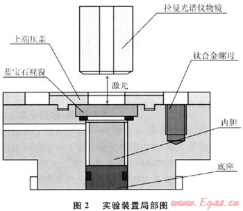 圖2為拉曼光譜原位觀測裝置的局部圖,拉曼光譜儀的激光透過藍(lán)寶石窗口聚焦在水合物表面,可得到水合物的拉曼光譜圖。反應(yīng)釜分為上下兩個部分,兩部分的結(jié)合部借鑒了相機(jī)和鏡頭的卡口結(jié)構(gòu),便于開閉。釜體上部的壓蓋采用螺釘壓緊,螺釘、上端壓蓋、藍(lán)寶石視窗以及容器寶石密封端就成為一個整體。這一部分通過與一個帶有“O”形圈密封的容器底座結(jié)合,形成一個密封的壓力容器腔。腔體內(nèi)部設(shè)有內(nèi)膽,容積約1.1mL,用于裝填反應(yīng)介質(zhì)。